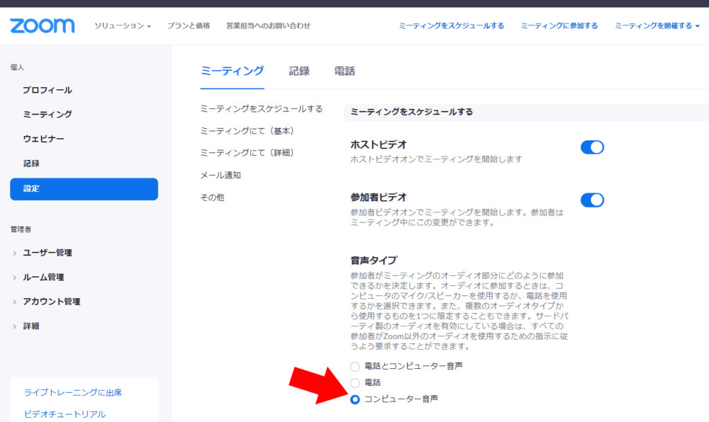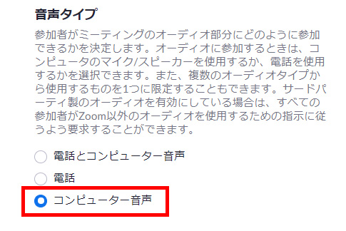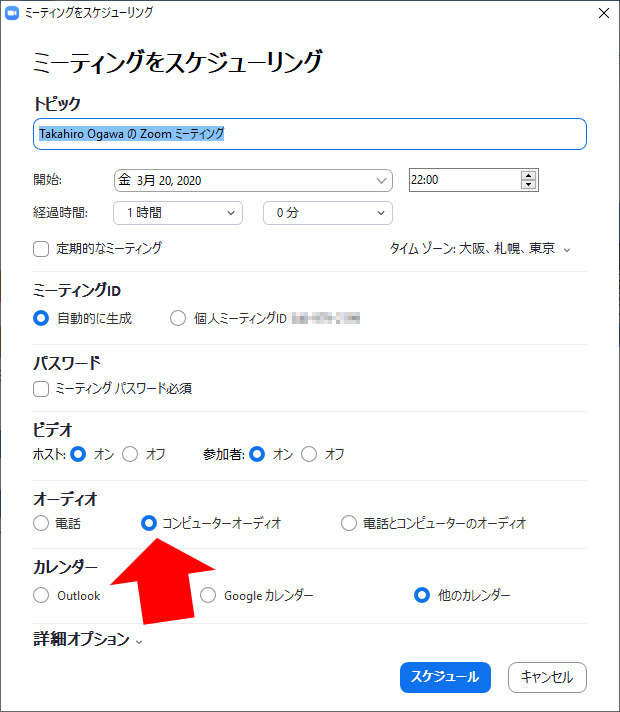 そうすると、Zoomアプリでスケジューリングをするときにも、最初から「コンピューターオーディオ」が選択されるようになります。