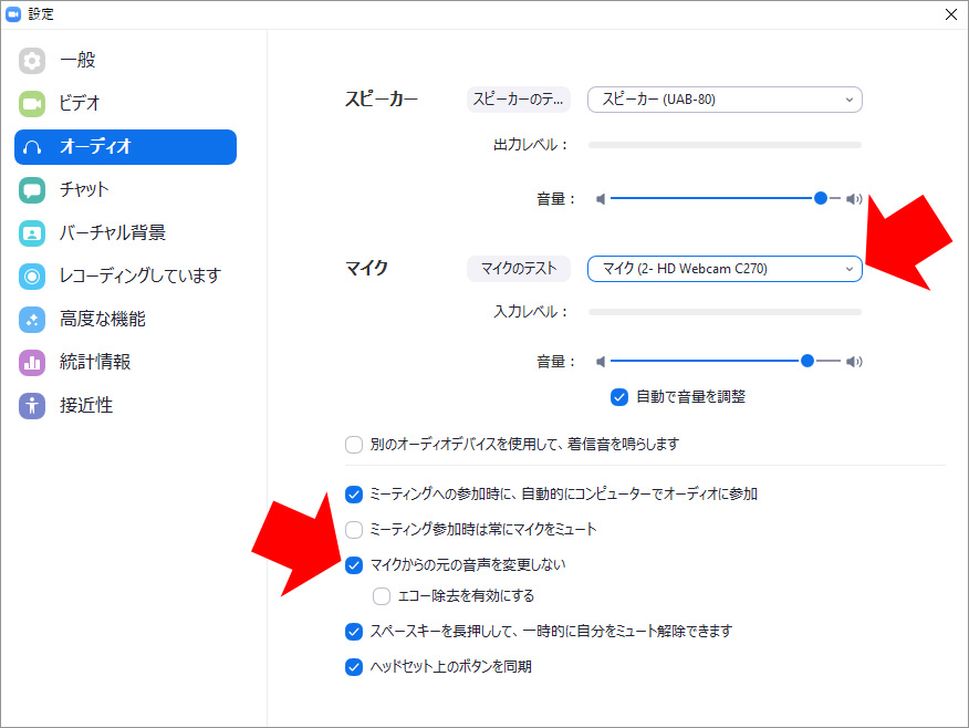 そして、オーディオ設定のところでは、「マイクからの元の音声を変更しない」を ON にしておきましょう。