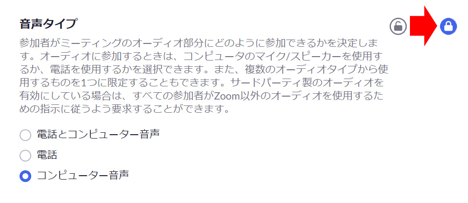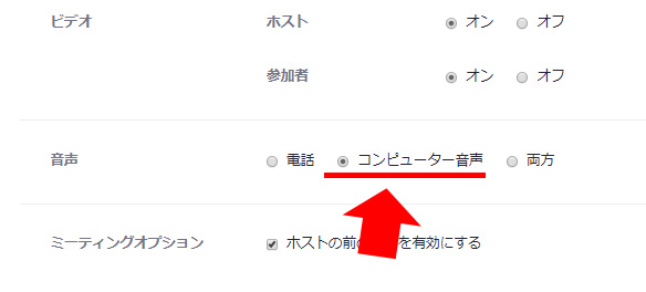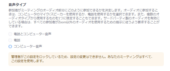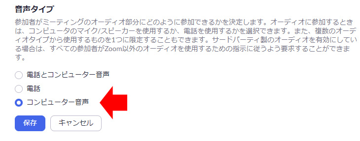 ミーティングを設定するときに、音声タイプを「電話とコンピューター音声」や「電話」に変更することもできます。