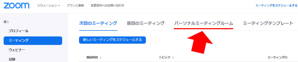 zoom.us の「ミーティング」から「パーソナルミーティングルーム」を選択します。