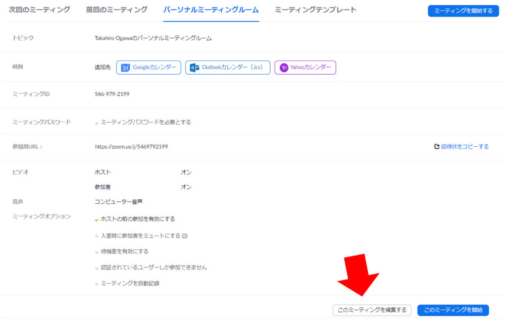「このミーティングを編集する」をクリックして、パーソナルミーティングについての設定をします。