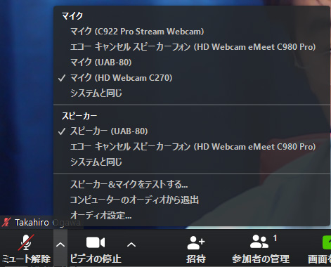 そうすると、パーソナルミーティングIDを使ったミーティングでは、「ミュート / ミュート解除」の右側の「^」をクリックしても、「電話のオーディオに切り替える」というオプションは表示されません。