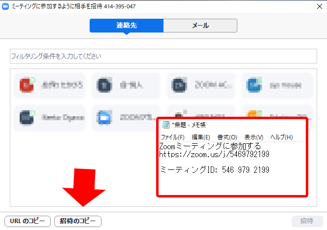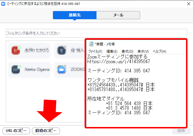 また、「招待」のボタンから、「招待のコピー」をクリックして、メールなどに貼り付けると電話でミーティングに参加するための電話番号などが表示されます。