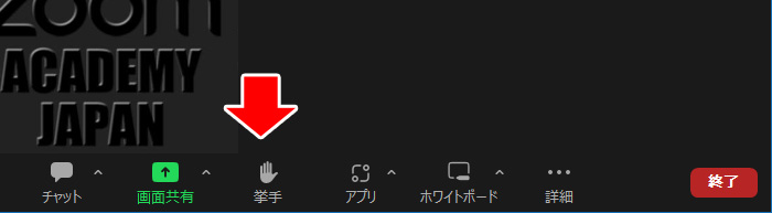 Zoomミーティングの画面には、「挙手」ボタンだけが表示されます。