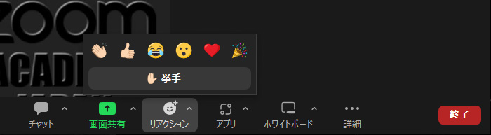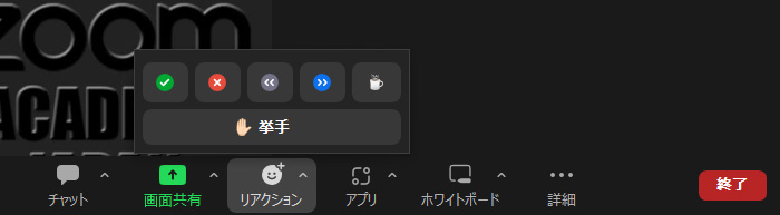 Zoomミーティングでは、「リアクション」ボタンが表示され、それをクリックすると「意思表示アイコン」と「挙手」ボタンのみが表示されます。
