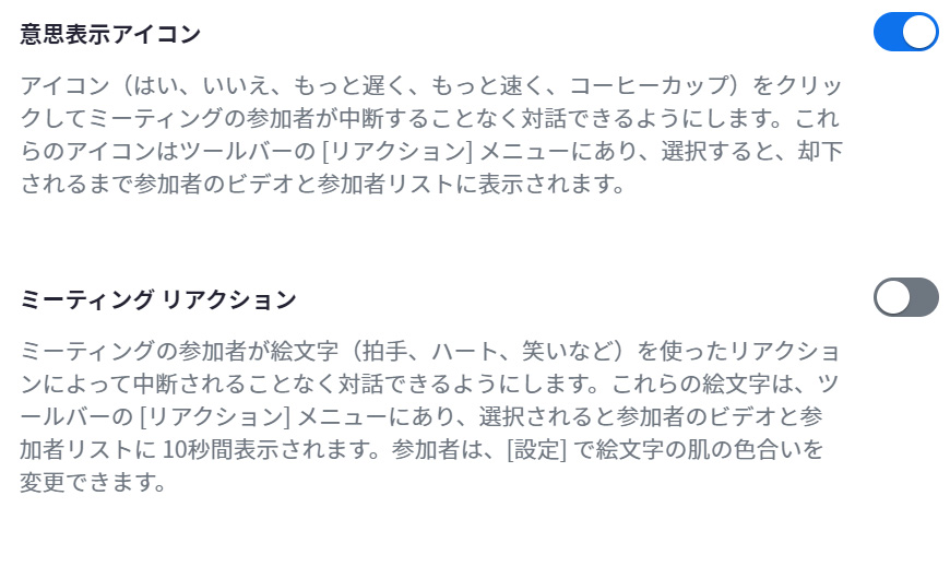 「意思表示アイコン」 ON 、「ミーティングリアクション」 OFF に設定した場合