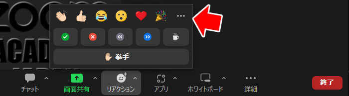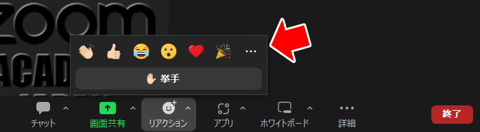 Zoomミーティングでは、「リアクション」ボタンが表示され、それをクリックすると「絵文字」と「挙手」ボタンのみが表示され、絵文字の右には「・・・」があります。