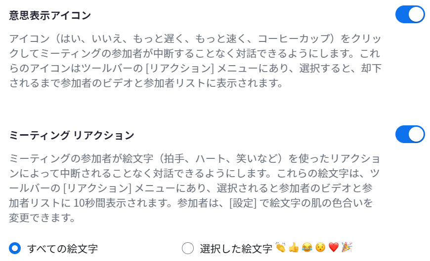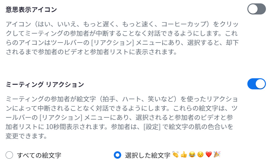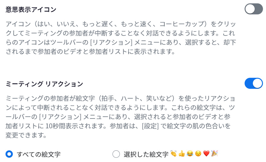 「意思表示アイコン」 ON 、「ミーティングリアクション」 ON に設定し、「すべての絵文字」を選択した場合