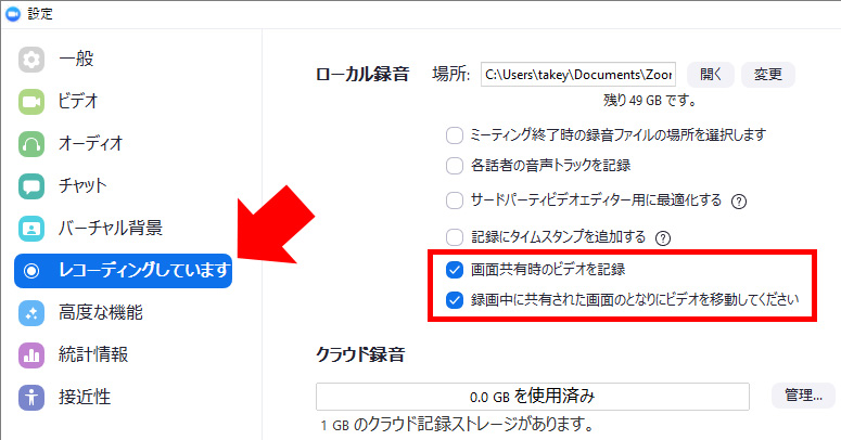 もう一つは、画面共有をしているとき、録画データに参加者の映像を表示させたり、消したりできる方法です。