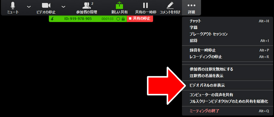 「詳細」の中から、「ビデオパネルの非表示」をクリックします。