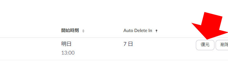 削除されたミーティングスケジュールの一覧は表示されるので、「復元」をクリックすれば、もとに戻ります。