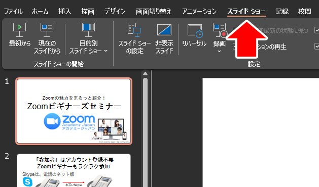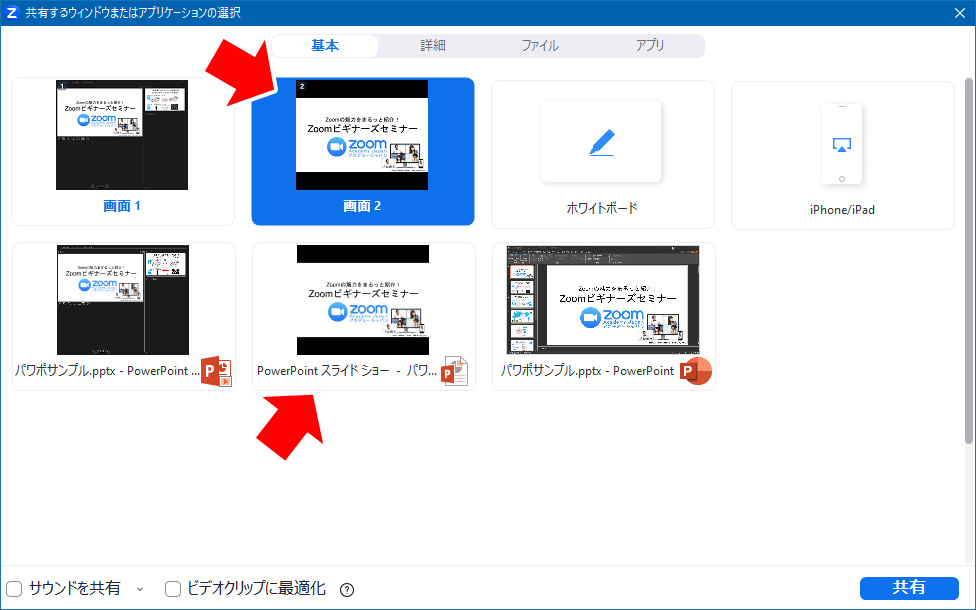 Zoomでは、画面共有で、パワーポイントのスライドショーを共有します。