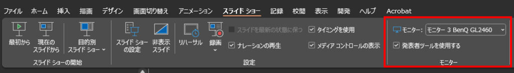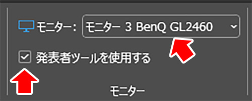 ここで、モニターをプロジェクターに設定し、発表者ツールを使用するにチェックを付けます。