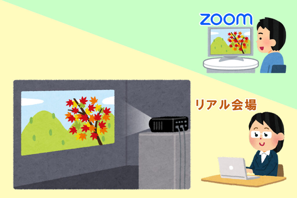 このとき、会場のスクリーンにプロジェクターで資料を投影すると同時に、Zoomの参加者には画面共有で資料を見せることになります。