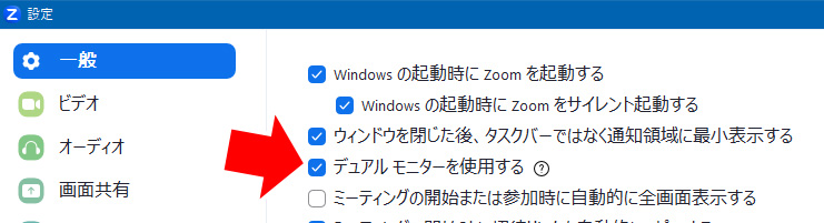 Zoomのデスクトップクライアントで設定画面を表示し、設定の「一般」の中にある「デュアルモニターを使用する」にチェックを付けます。