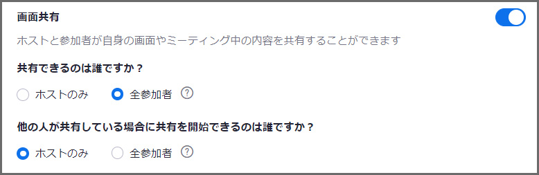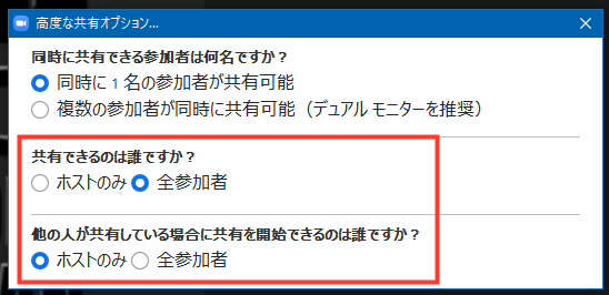 反対に、ホスト、共同ホストだけしか画面共有ができないようにするには、ここのチェックが外れた状態にします。