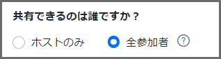 ここは、「ホストのみ」がデフォルトになっているので、ホスト、共同ホスト以外に画面共有をしてもらいたい時には、「全参加者」にチェックを付けます。