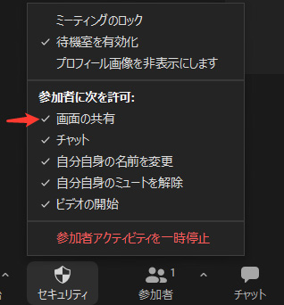 参加者全員が画面共有でるようにするには、「セキュリティ」ボタンをクリックして、「画面の共有」にチェックが付いた状態にします。