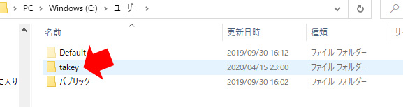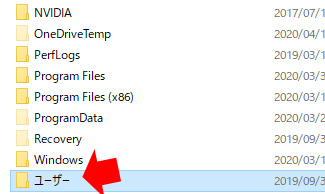 エクスプローラーが開きますので、Cドライブの「ユーザー」を開きます。