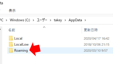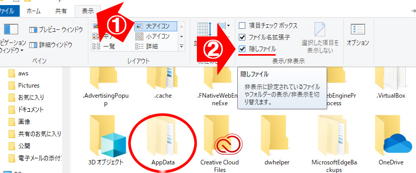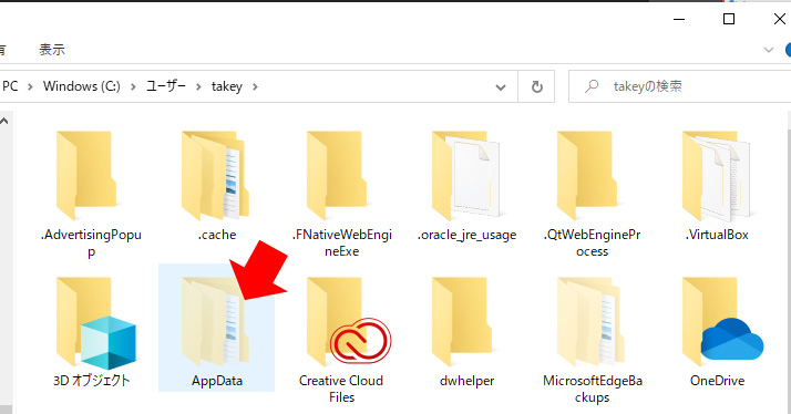 「AppData」が見えない場合は、隠しファイルを表示させてあげます。