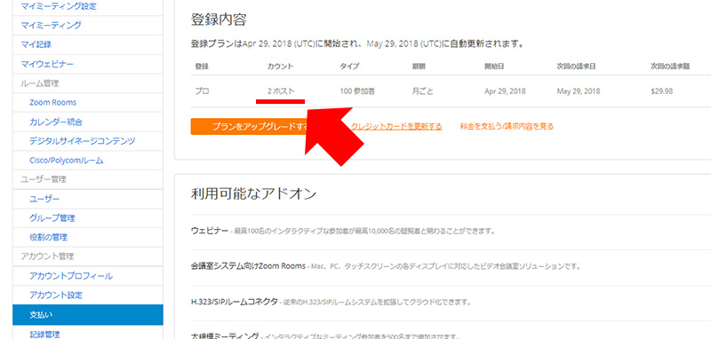 「支払い」をクリックすると、2ホストになっていることを確認します。