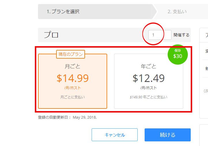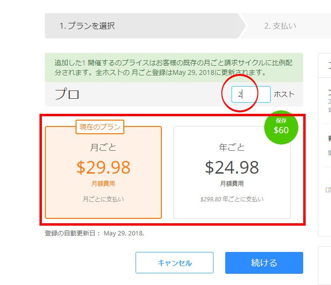 ここを2ホストにすると、金額も2倍になりますので、「続ける」をクリックして支払いをして下さい。