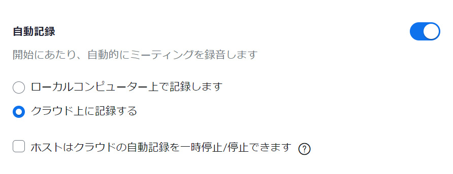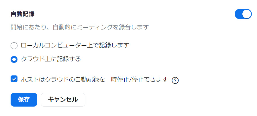 ローカルコンピューターに記録するか、クラウドに記録するかも、「自動記録」で設定できます。