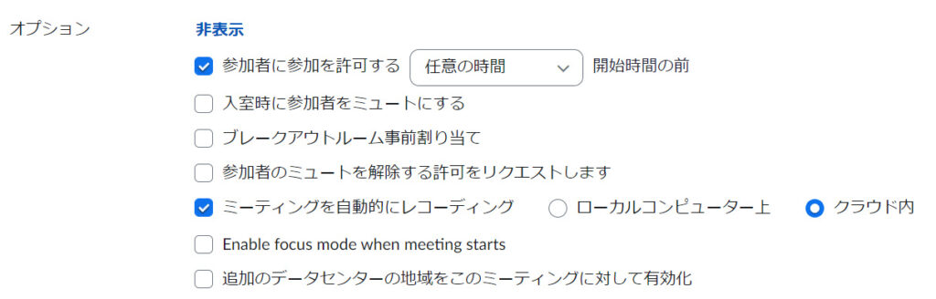 自動記録」をONにしておくと、ミーティングやウェビナーをスケジュールするとき、「ミーティングを自動的にレコーディング」にチェックが付き、「自動記録」で設定した録画場所も反映されます。