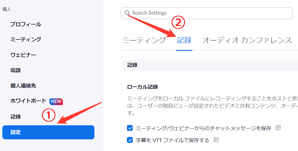 まず、チャットをクラウド上に保存するときは、「設定」から、「記録」を選択します。