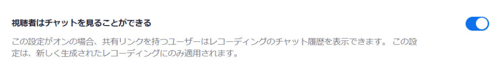 この項目がないときには、「設定」から、「記録」を選択し、ページのかなり下の方にある「視聴者はチャットを見ることができる」というスイッチをONにします。