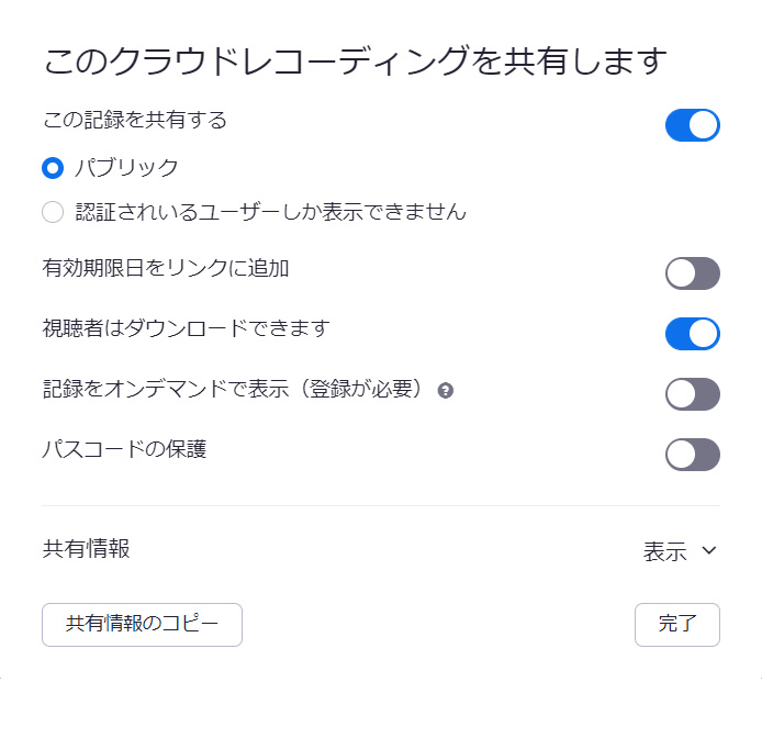 このスイッチをONにするか、OFFにするかで、動画共有を設定する表示が変わってきますので、注意してください。
