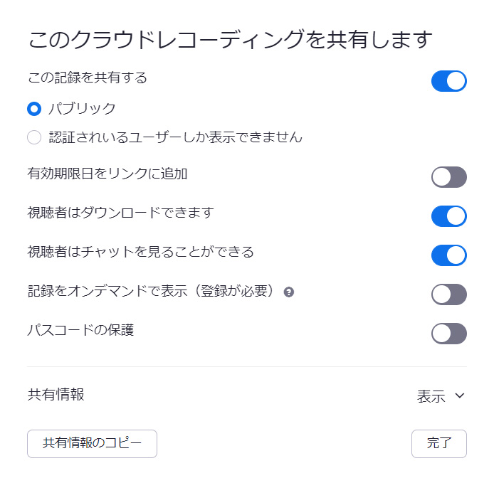 ここで、「視聴者はチャットを見ることができる」をONにすれば、チャットも共有され、OFFにすれば、動画のみの共有で、チャットは共有先に表示されません。