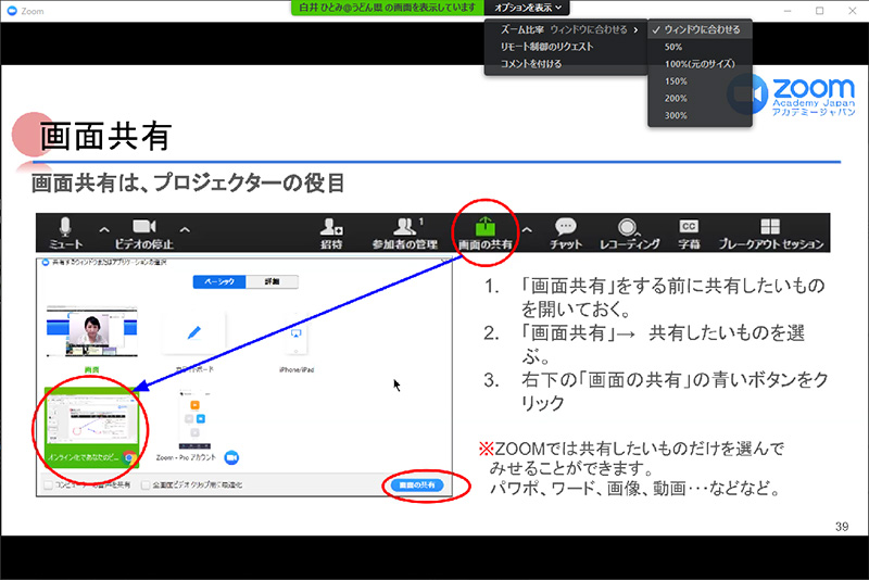 その中の「ズーム比率」を選択すると、共有されている画面の大きさを変更することができます。