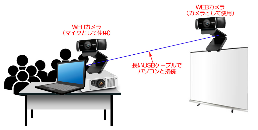パソコンには、もう一つのマイク内蔵WEBカメラを繋ぎ、このWEBカメラにはみんなの声が入りやすいようテーブルの真ん中に置きます。