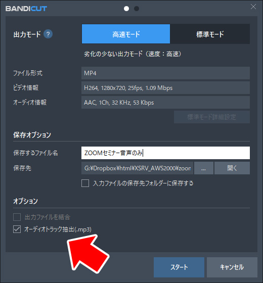 Bandicutで出力する際、「オーディオトラック抽出」にチェックを入れます。