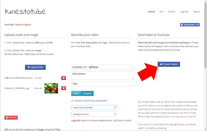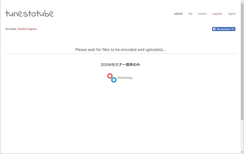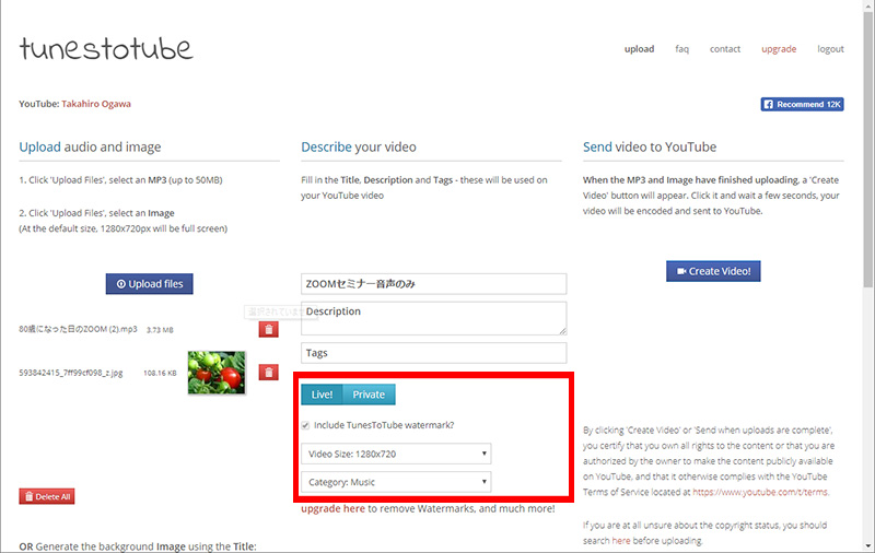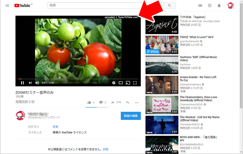 アップロードされた動画には、右上に小さくtunestotube.com の文字が入りますが、気にならないほどの大きさです。