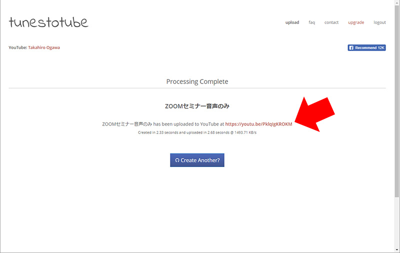 動画データの作成からYoutubeへのアップロードが完了すると、下のような画面になります。