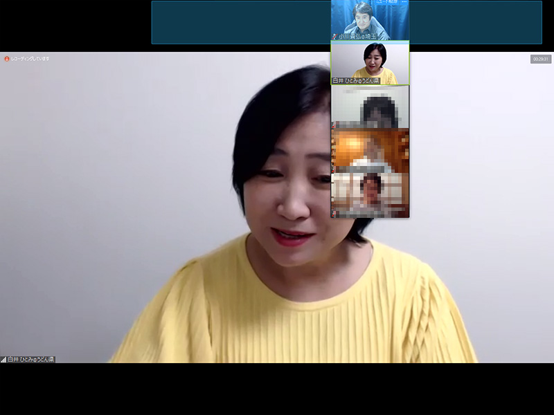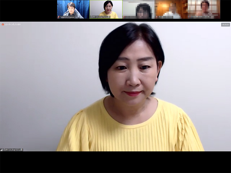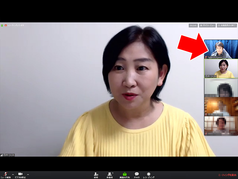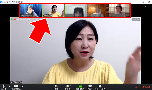 全画面表示ではないときは、このように、話している人以外は、上に横並びになっています。