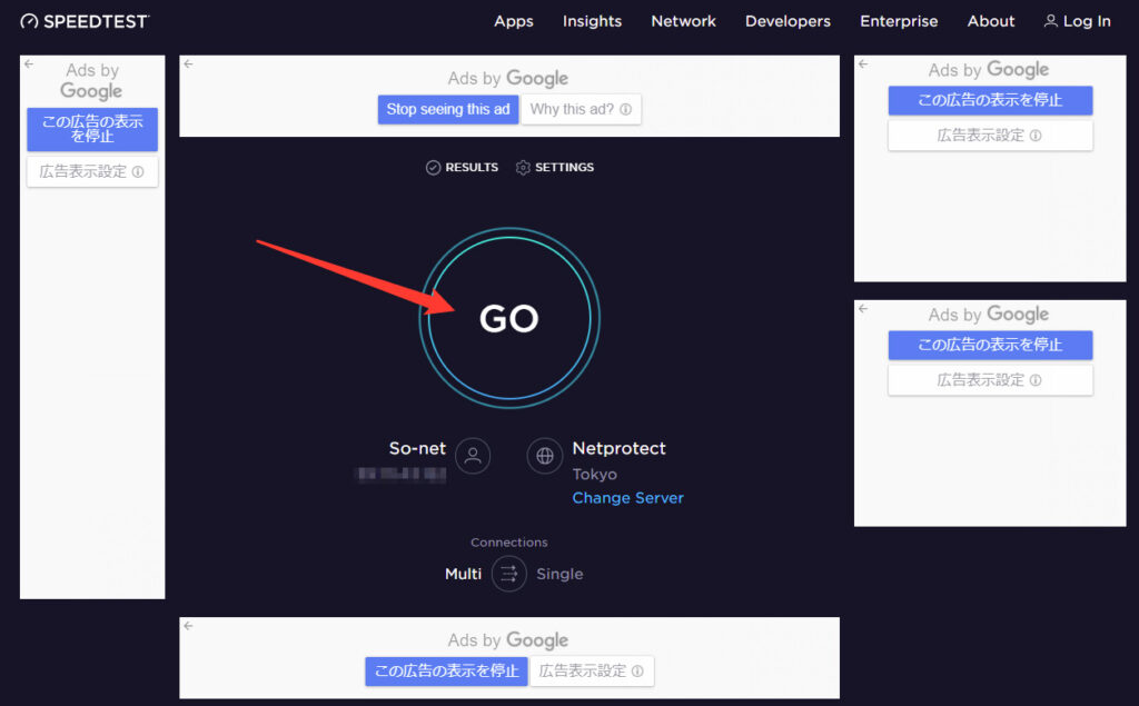 インターネット回線の速度を測るサイトは、いろいろありますが、手軽に使えるこちらのサイトで、計測してみてください。