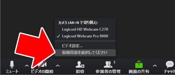 すると、「ビデオの停止」の右側の「^」マークの中に、「仮想背景を選択して下さい」というメニューが出てきます。