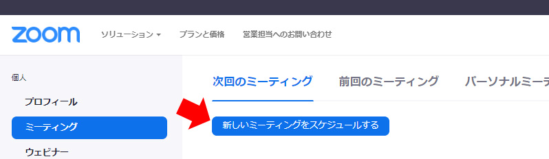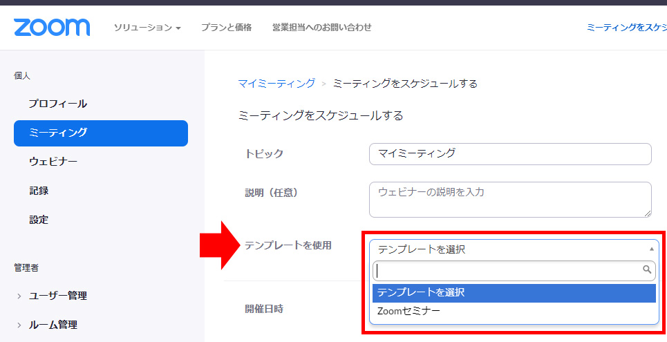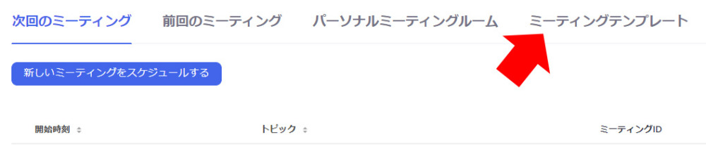 次回、ミーティングを作成するときには、「ミーティングテンプレート」をクリックします。