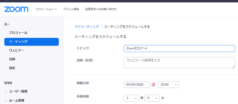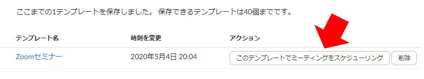 作成したテンプレートが一覧表示されますので、「このテンプレートでミーティングをスケジューリング」をクリックして、スケジュルを作成します。