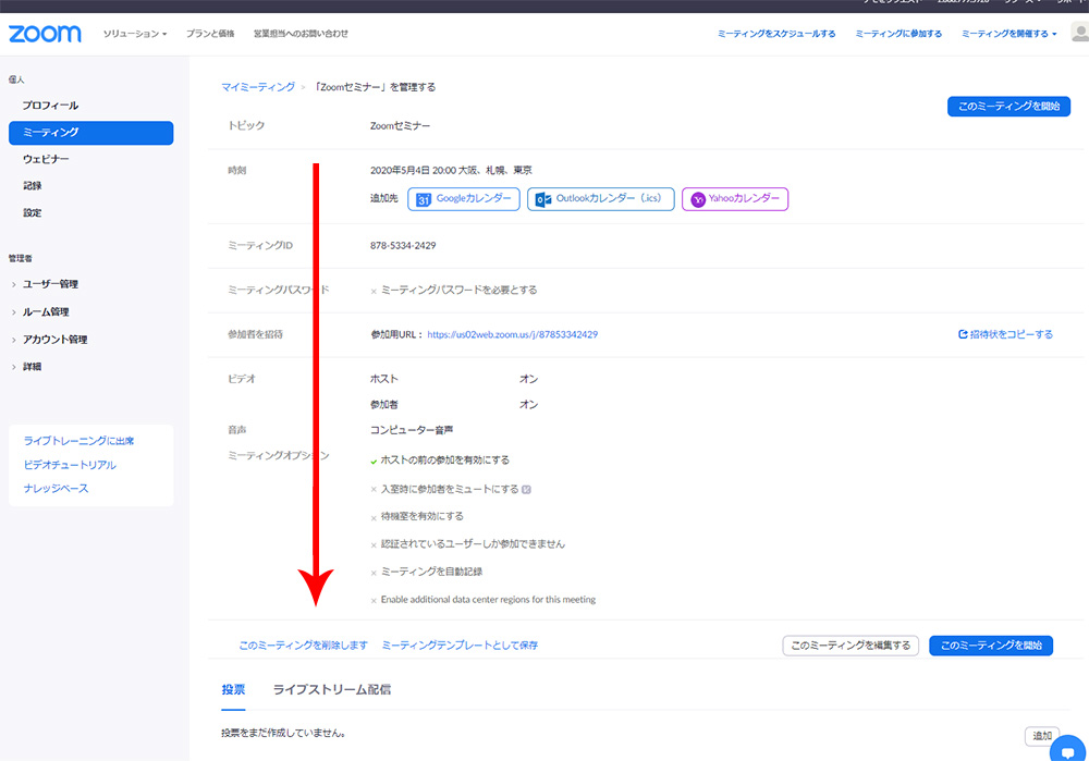 投票を作成したら、「ミーティングテンプレートとして保存」をクリックします。