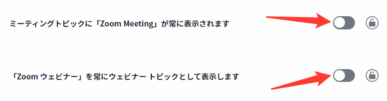Zoomウェビナーの場合は「「Zoom ウェビナー」を常にウェビナー トピックとして表示します」という項目です。