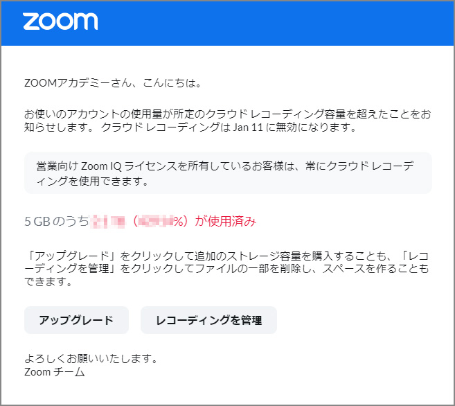 クラウド上に 5GB 以上の録画データが残っていると、その状態から開始した Zoom ミーティングや Zoom ウェビナーで、クラウド録画ができなくなります。