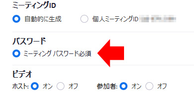 また、ミーティングをスケジュールする場合には、「ミーティングパスワード必須」にチェックが入った状態になります。