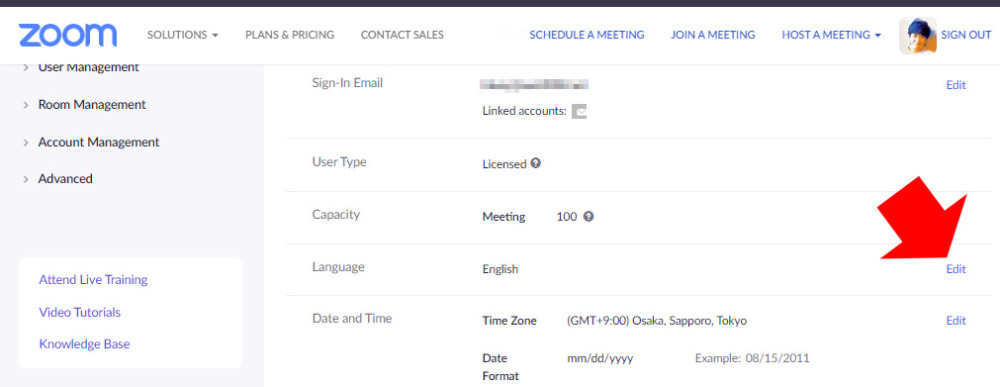 「Language」の項目が、「English」になっているので、右端にある「Edit」をクリックします。