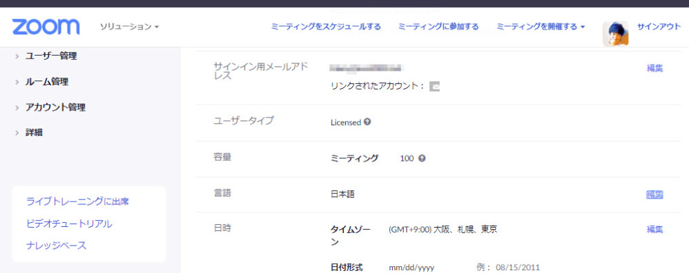 このとき、zoom.usにサインインした状態で、プロフィール設定に接続します。