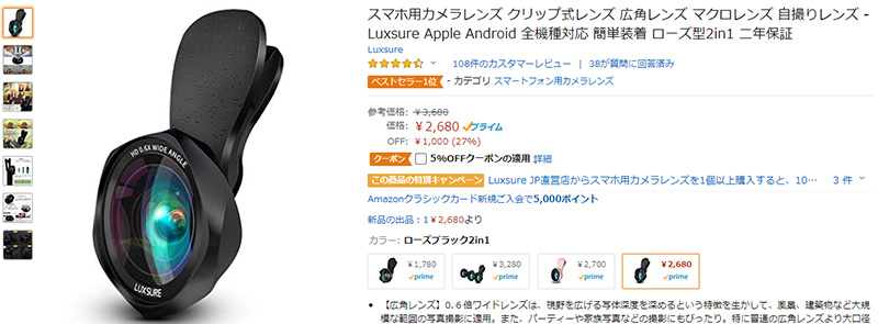 スマホ用カメラレンズ クリップ式レンズ 広角レンズ マクロレンズ 自撮りレンズ – Luxsure Apple Android 全機種対応 簡単装着 ローズ型2in1 二年保証