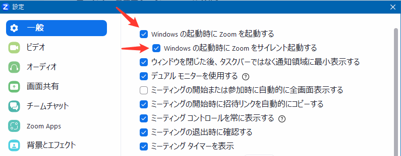 パソコン起動時に、Zoomの起動画面が表示されず、こっそりと起動させたいのであれば、「Windowsの起動時に Zoom をサイレント起動する」にチェックを入れましょう。